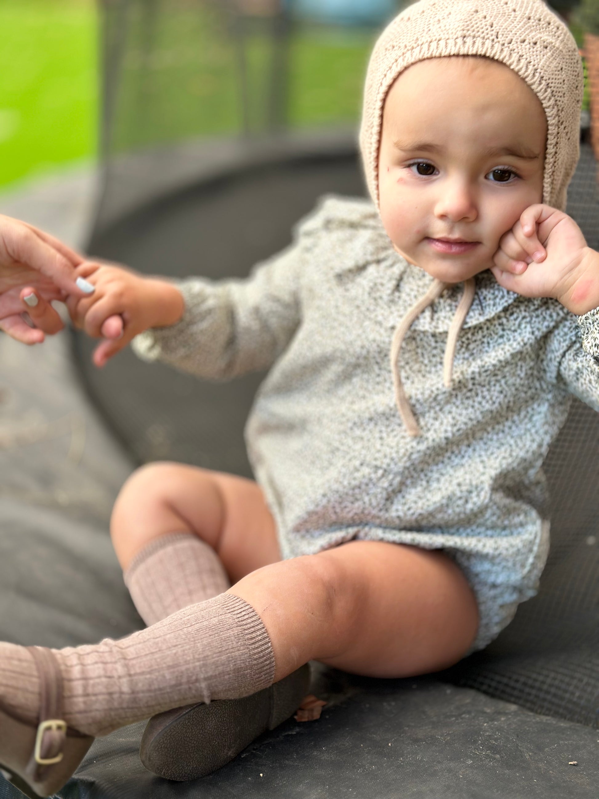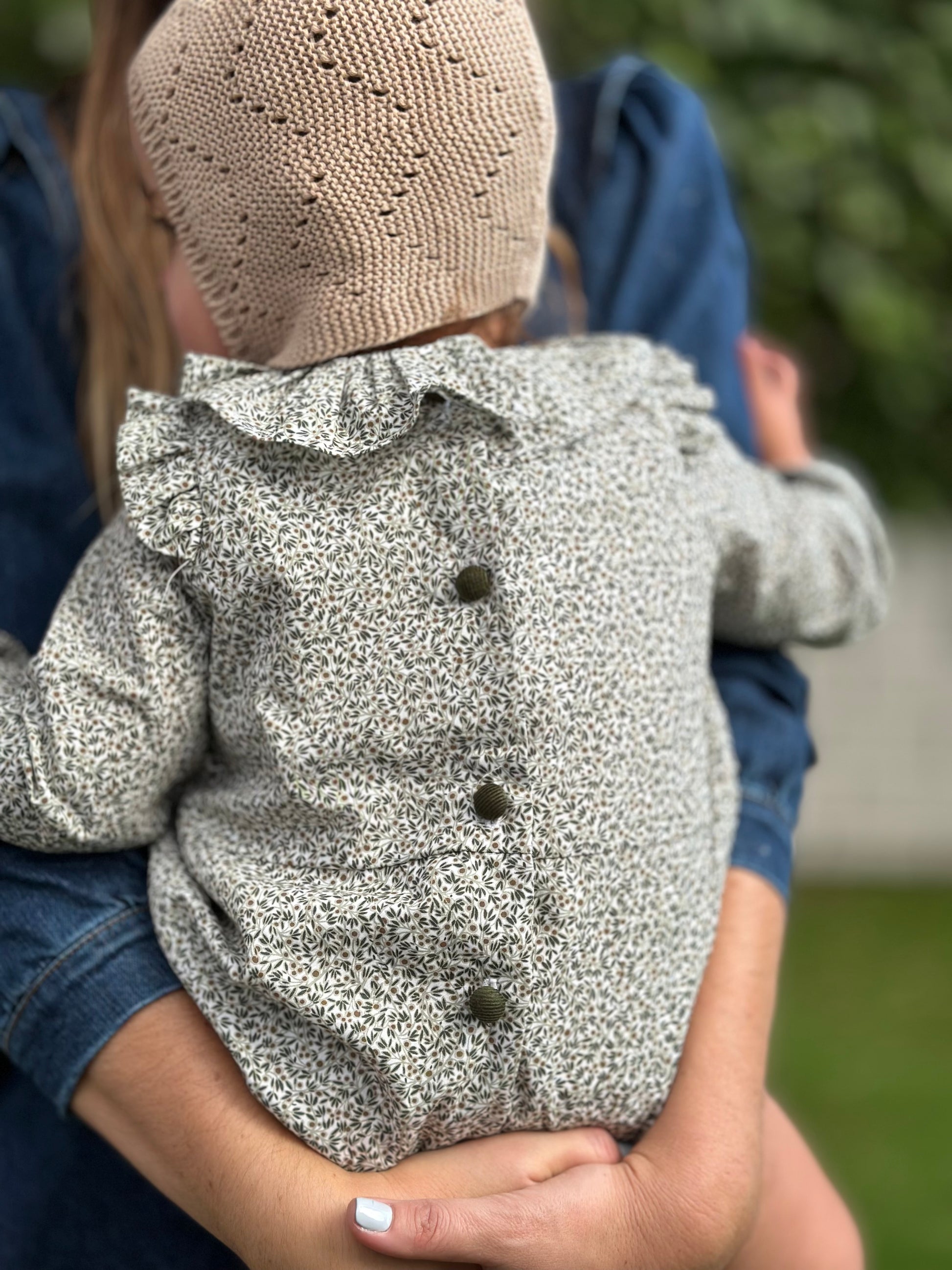 Para los más pequeños de la casa tenemos el pelele olivo, con una tela preciosa en mini olivas en tonos verdes.
