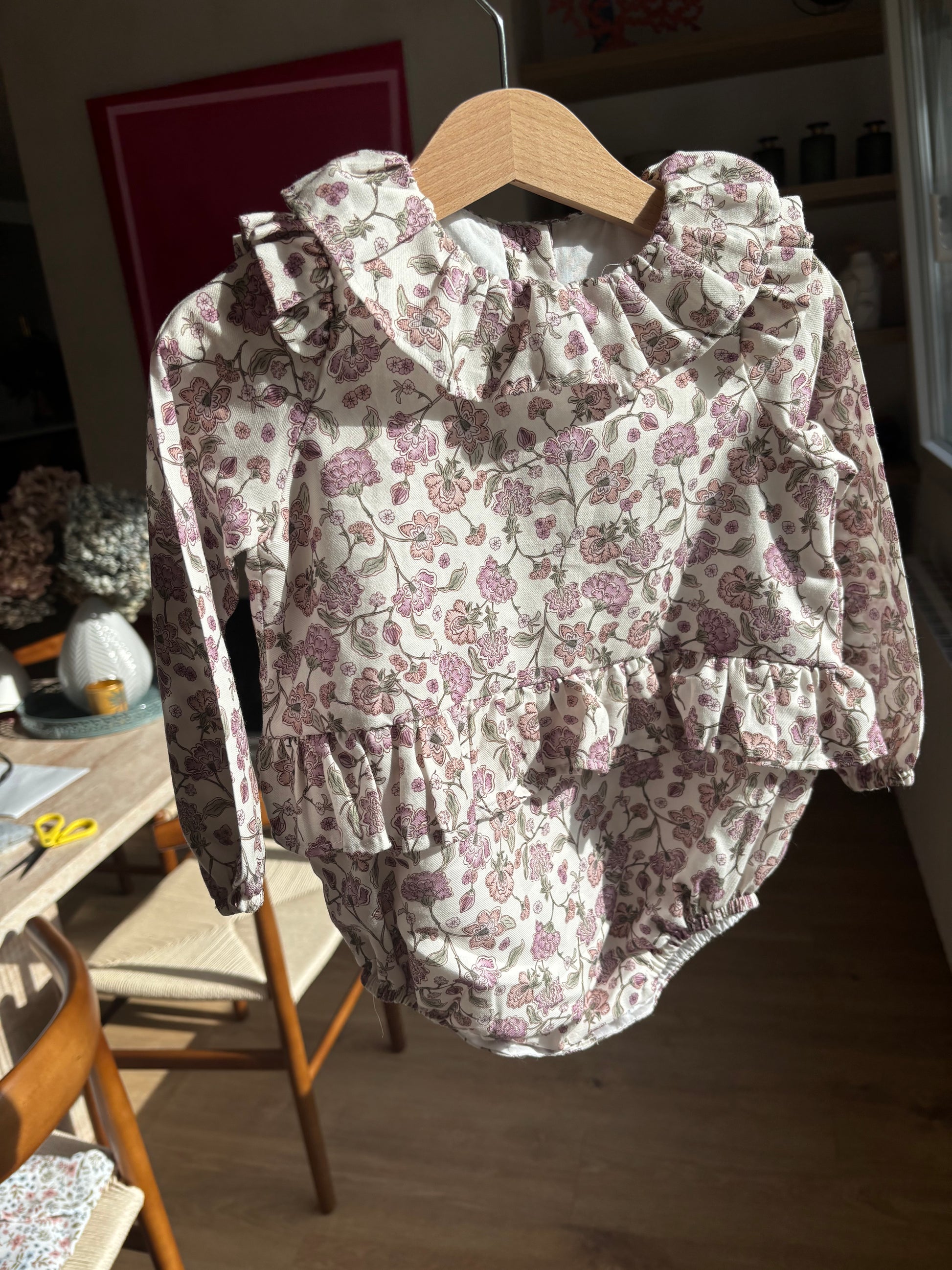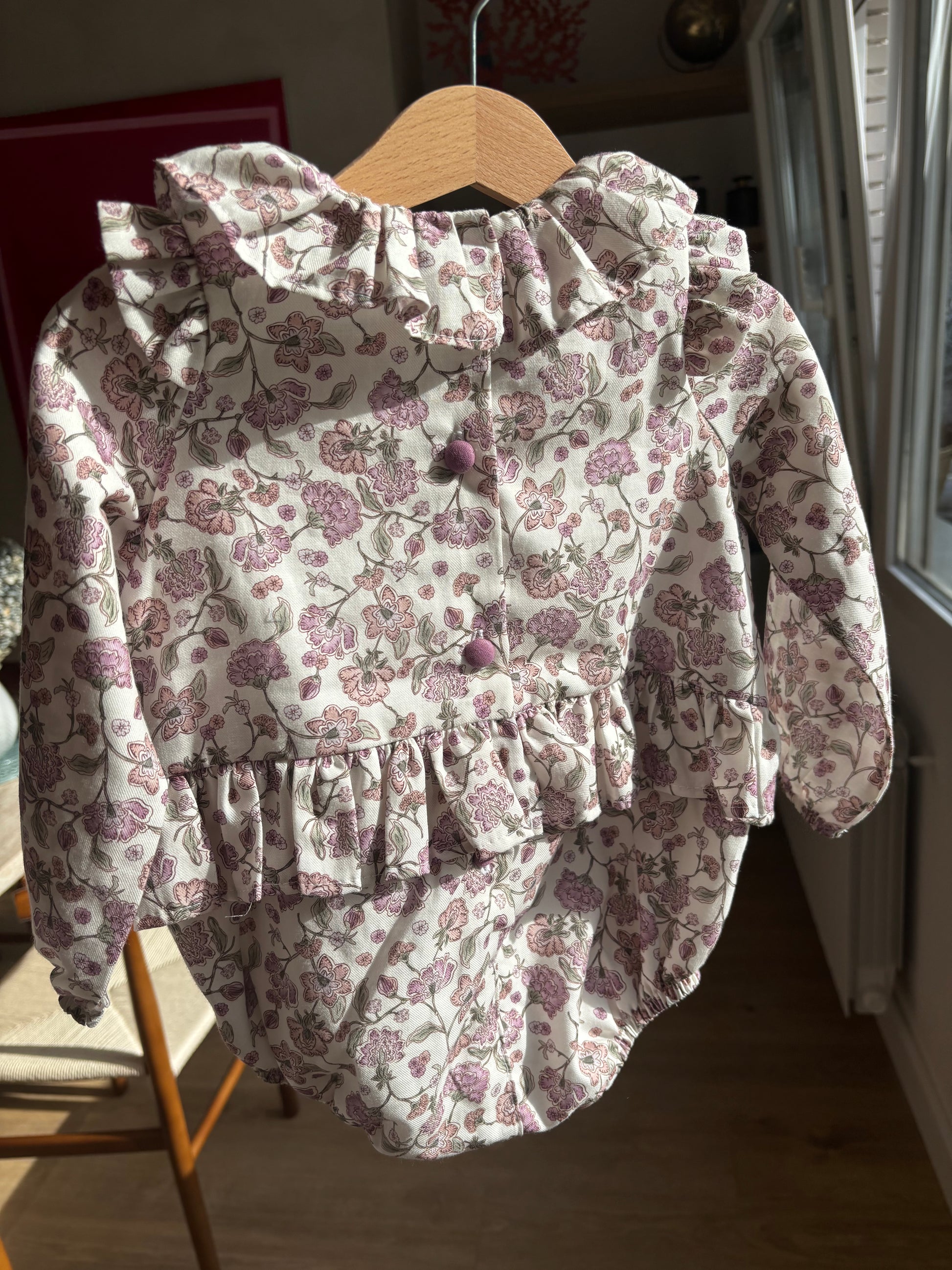 Para los más pequeños de la casa tenemos el pelele Clavel, con una tela preciosa en claveles lilas y verdes.