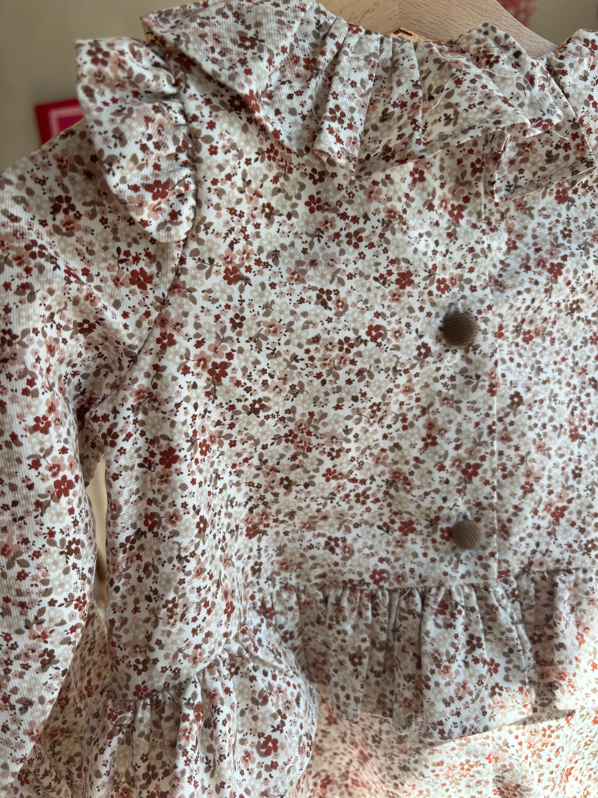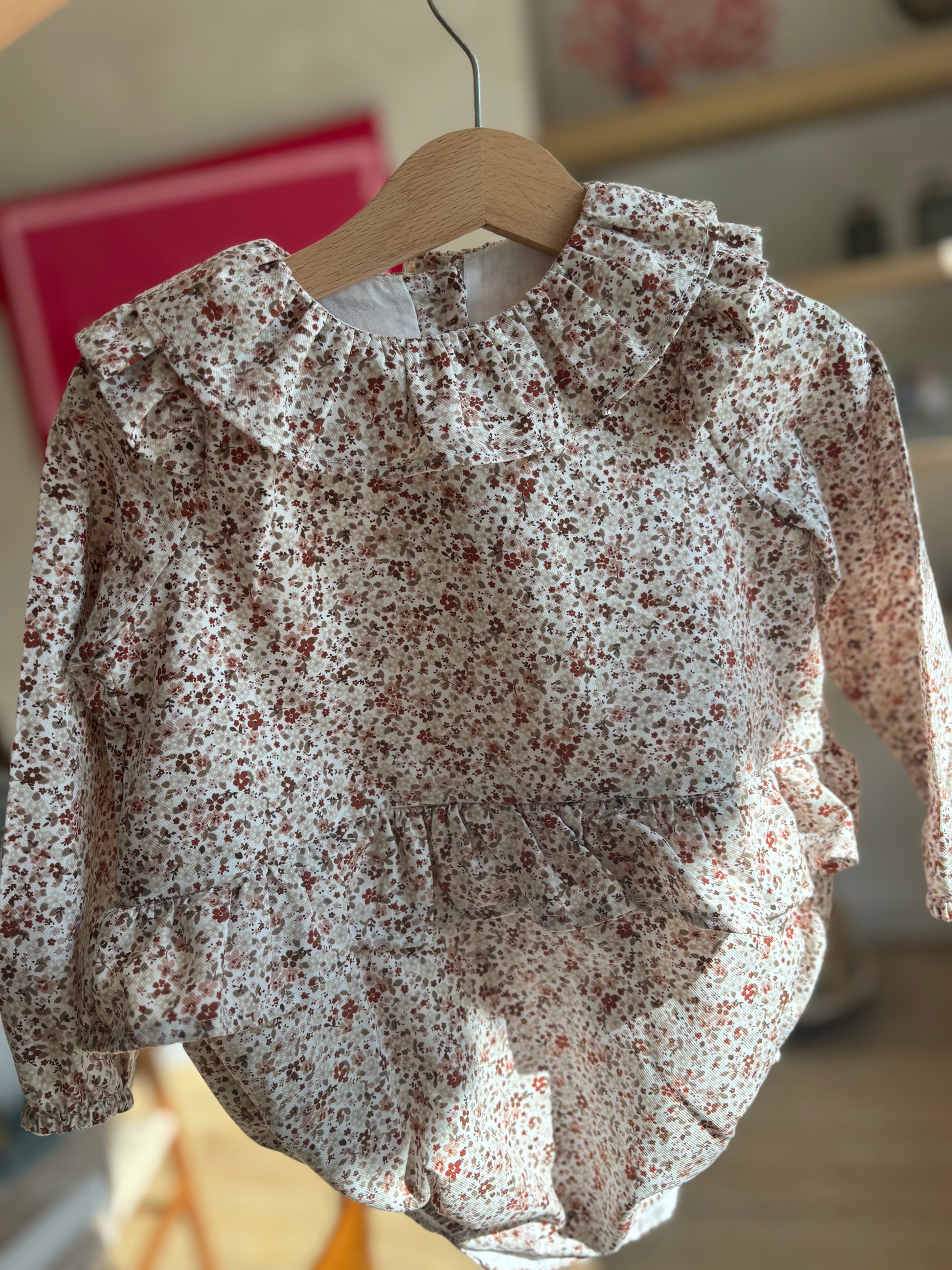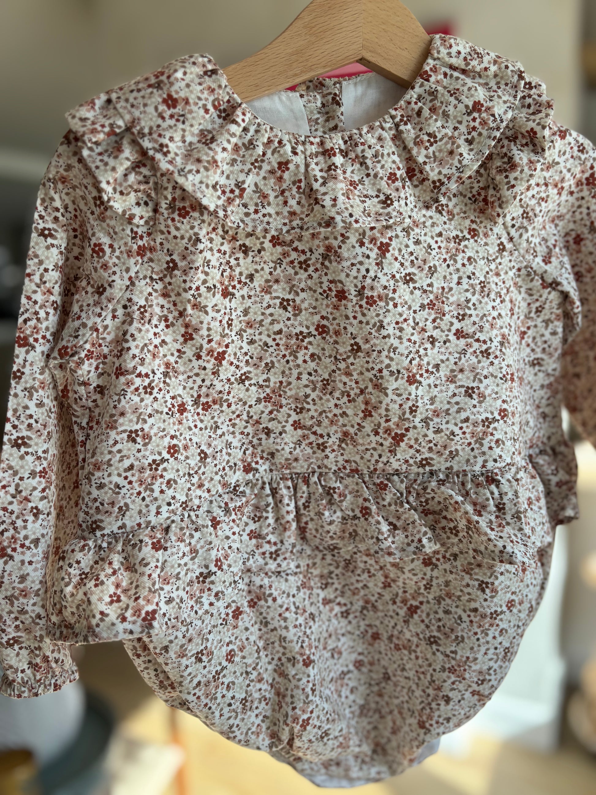 Para los más pequeños de la casa tenemos el pelele pradera, con una tela preciosa en mini florecitas en tonos beige y marrones.