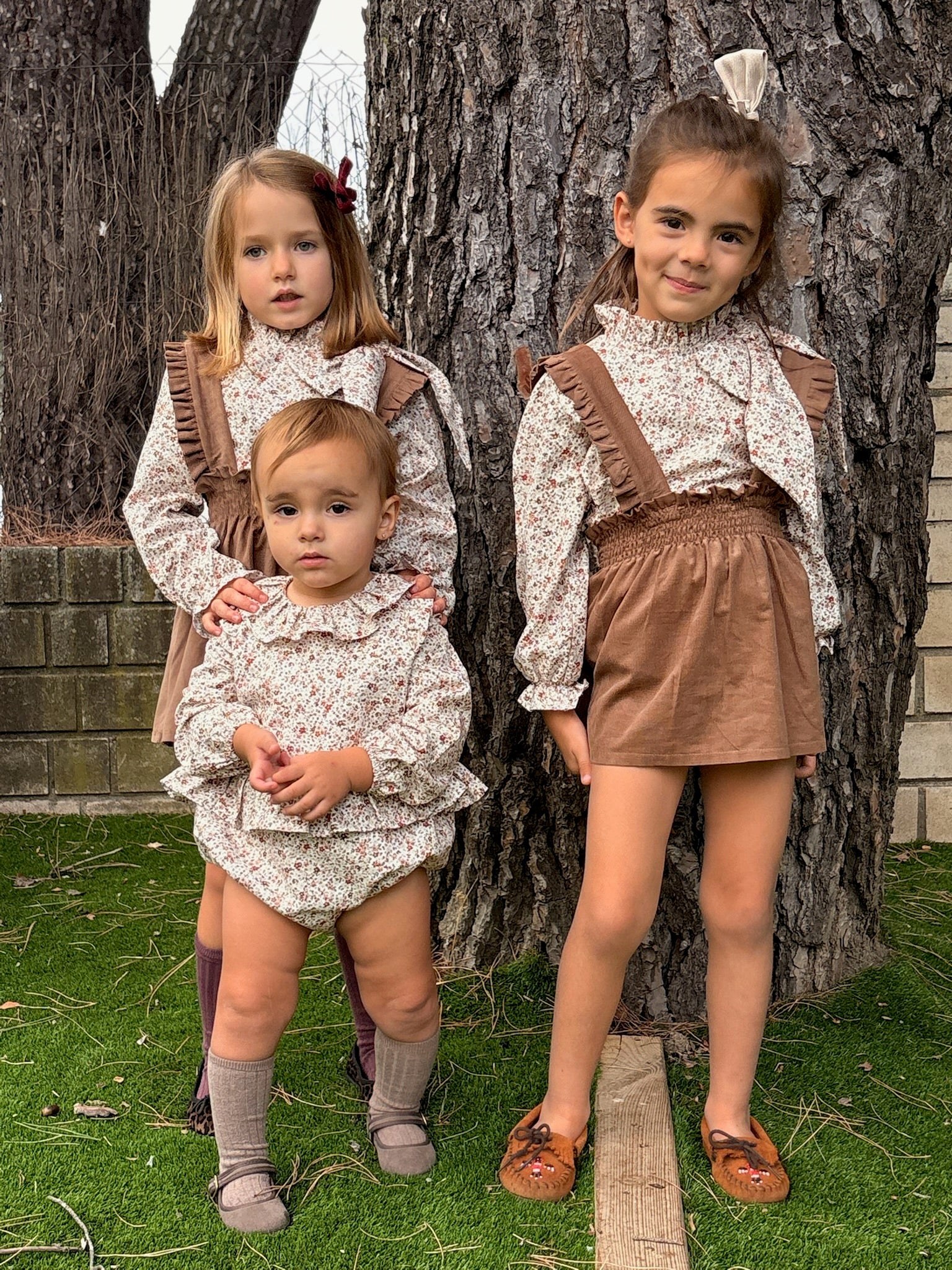 Combina hermanos con la Blusa Pradera , Falda con tirantes marrón las Poleras Bambula cruda y Pantalón corto marrón.